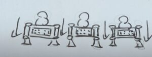 谷を1本の細い綱を伝って渡り切ろうとしている、一列に並んだ3人組。対岸では到着を見守っている存在がいました。