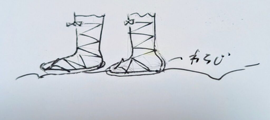 わらじ? が脱げない様にしっかりとすね辺りまで紐で固定されているようでした。