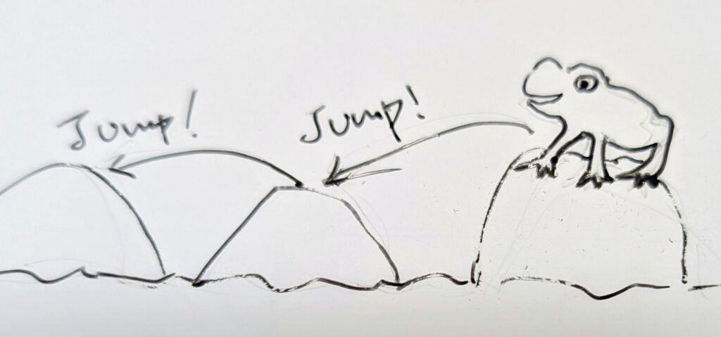 カエルが岩をジャンプして前進している様子でした(笑)。