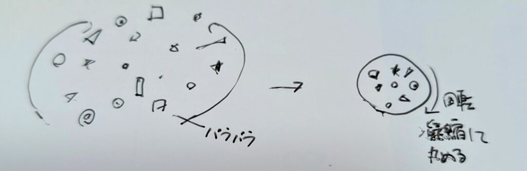 散らばって存在している異素材を集め、生地を作る様に固めて丸めていく作業。。といった絵でした。